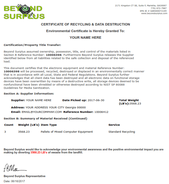 We are Registered with the state of Georgia as an Electronics Recycler, we comply with all recycling laws. Unquestionably, Beyond Surplus keeps all electronics waste out of the landfill, We do not export any hazardous materials to other countries compared to other Georgia companies.