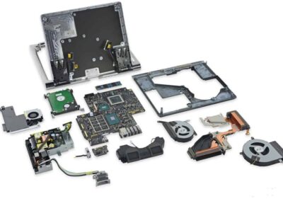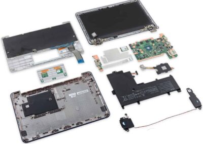 Scrap laptops are dismantled into their composite materials which can then be recycled and entered back into the manufacturing process, glass, aluminum, plastic circuit board etc.
